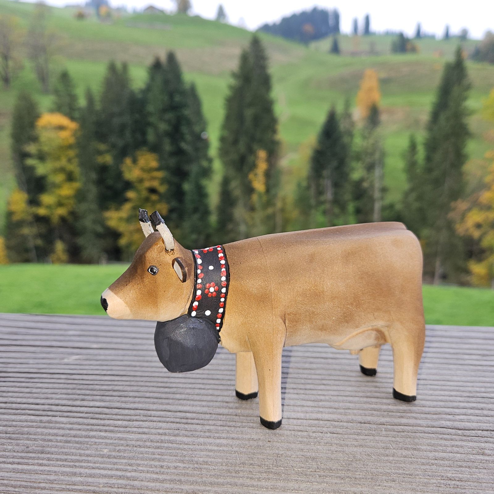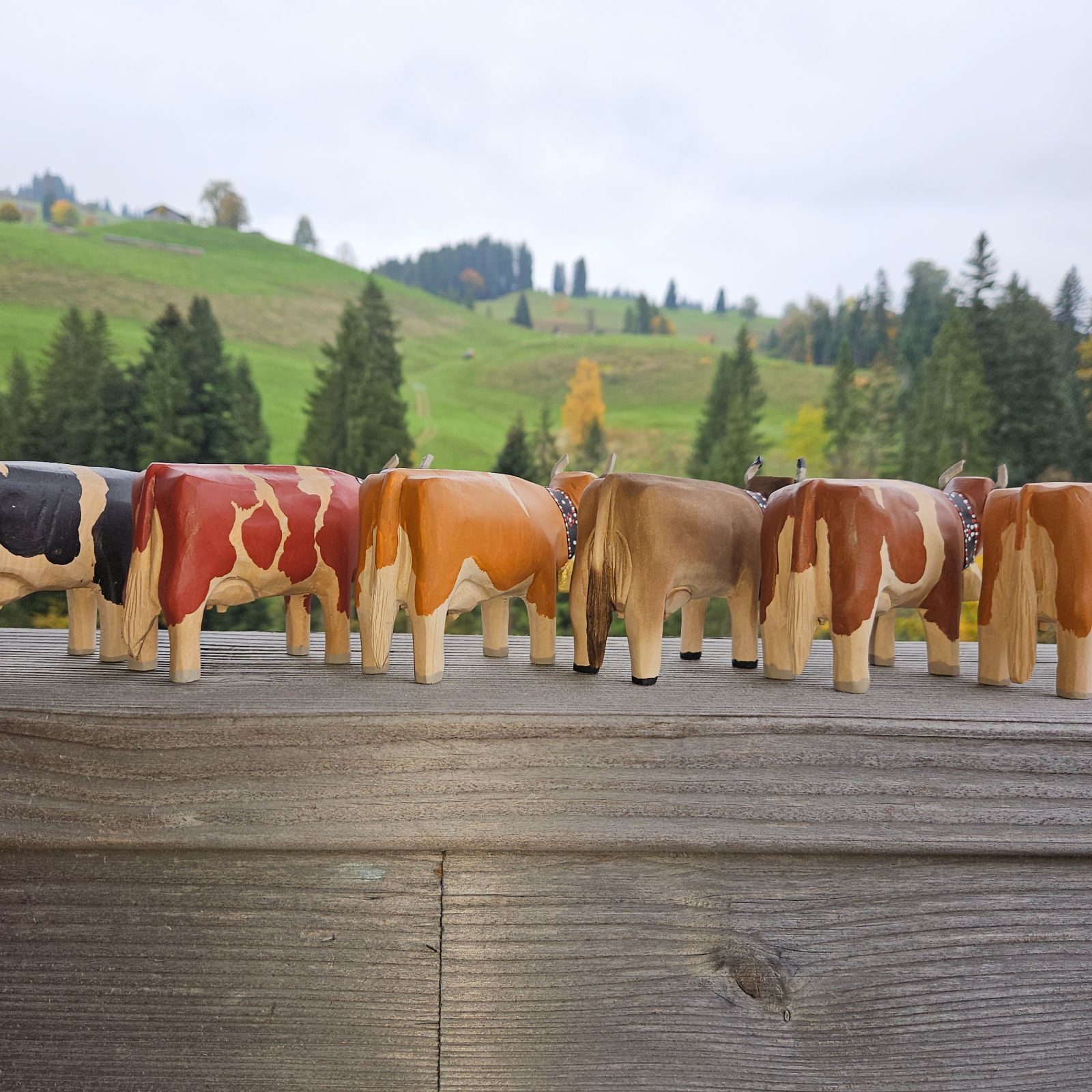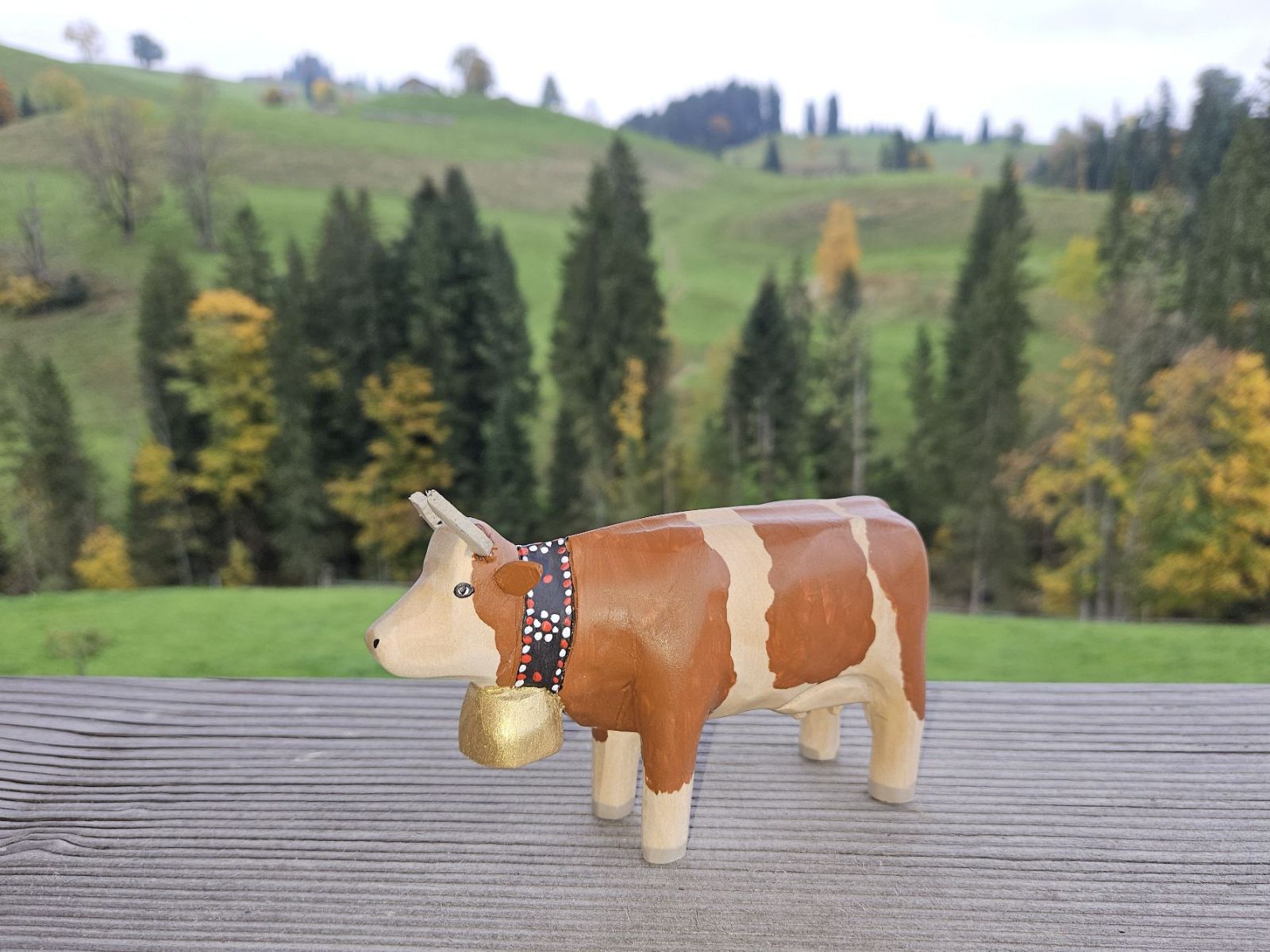 Spielzeug-Holzkuh aus regionalem Lindenholz handgeschnitzt und handbemalt. Ohren und Hörner aus Leder. In diversen Farben erhätlich.