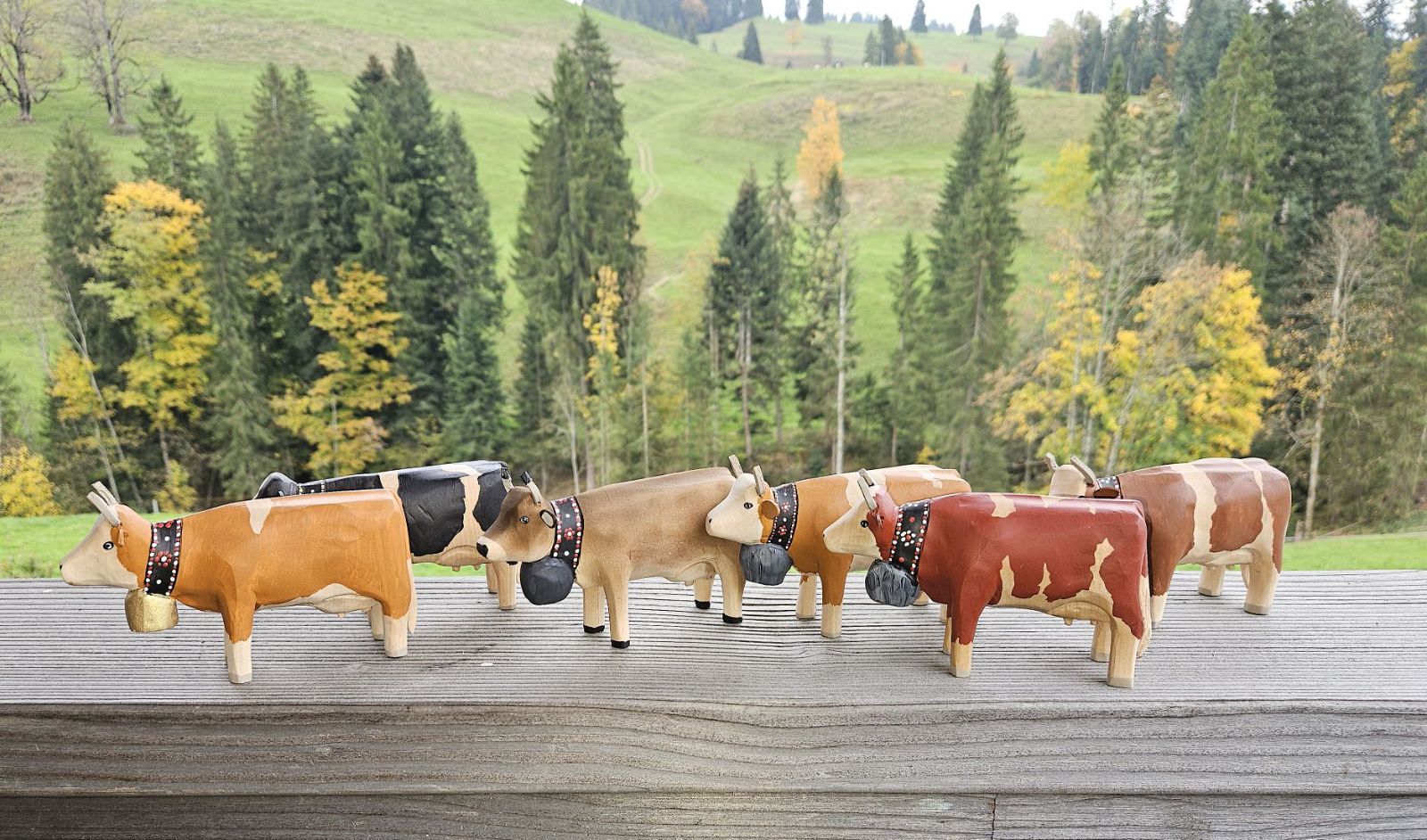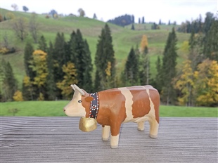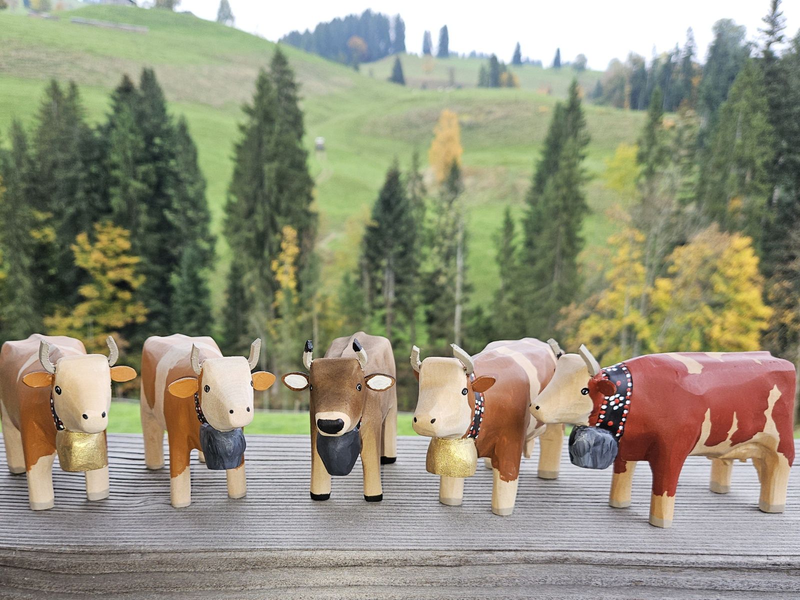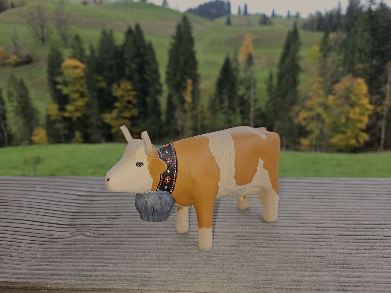 Spielzeug-Holzkuh aus regionalem Lindenholz handgeschnitzt und handbemalt. Ohren und Hörner aus Leder. In diversen Farben erhätlich.