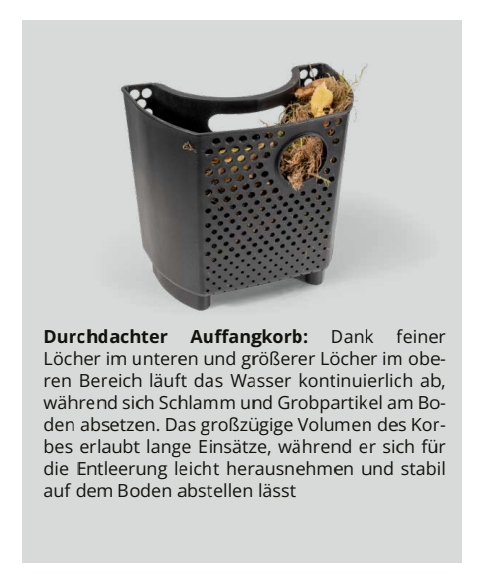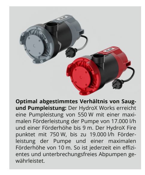 Der neue, grosse Auffangkorb und das bewährte Zyklonsystem gewährleisten eine effektive Abscheidung von Grobpartikeln, sowie Schaum. Ein 10m Schmutzwasserschlauch mit einem Durchmesser von 38mm und der universelle C-Rohr-Anschluss für Feuerwehr- und THW-Schläuche setzen die hohe Pumpenleistung optimal in tatsächliche Förderleistung um. Fur höchste Sicherheit sorgen ein PRCD-Personenschutzschalter und sichere Steckdosen (IP54 für HydroX Works 113010). Robuste Feststellbremsen, praktische Kabelhaken, ein flexibler Schubbügel und eine komfortable Zubehöraufbewahrung sorgen zudem für maximalen Bedienkomfort.