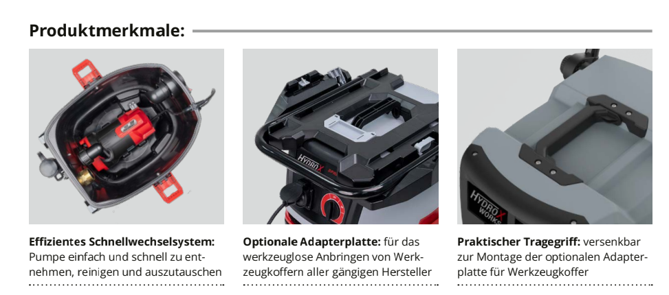 Die HydroX-Reihe setzt neue Massstäbe im Bereich Pumpsauger und ist optimal fur das Abpumpen grosser Wassermengen bei Hochwasser, Wasser- oder Brandschäden. Der HydroX Works (für Industrie) vereint maximale Saugleistung mit leistungsstarker Pumpe und kompakter Bauweise. Für die HydroX-Reihe mit 40I Behältervolumen gilt Made in Germany - so entsteht höchste Qualität und Zuverlässigkeit. Der Sauger bietet ein optimal abgestimmtes Verhältnis von Saug- und Pumpleistung, was jederzeit ein effizientes und unterbrechungsfreies Absaugen sicherstellt. Die trockenlaufsichere Pumpe ist mit einem Schnellwechselsystem ausgestattet und lässt sich einfach herausnehmen, reinigen oder austauschen.