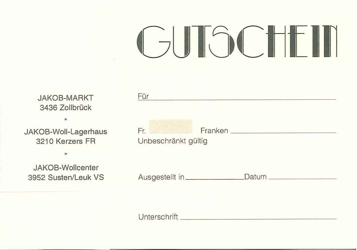 Mode & Bekleidung > Damen > Accessoires > Bekleidung > Herren > Accessoires > Bekleidung > Kinder > Accessoires > Bekleidung Gutschein Jakob-Markt Modelle:Gutschein Jakob-Markt CHF 50.-- (CHF 50.00)Gutschein Jakob-Markt CHF 100.-- (CHF 100.00)Gutschein Jakob-Markt CHF 150.-- (CHF 150.00) CHF 50.00 Verfügbarkeit: Lager Menge: -+ Lieferung: Abholung Vorauskasse Bitte wählen Sie zuerst aus den oben stehenden Optionen aus. in den Warenkorb Verkäufer: Jakob AG, Jakob-Markt 3436 Zollbrück Alle Produkte dieses Verkäufers Im Jakob-Markt finden Sie alles was das Herz begehrt. Hersteller: Jakob AG, Jakob-Markt Artikel weiterempfehlen Stichworte (Tags): GutscheinKleiderTextilienWolleStoffLebensmittel Zurück