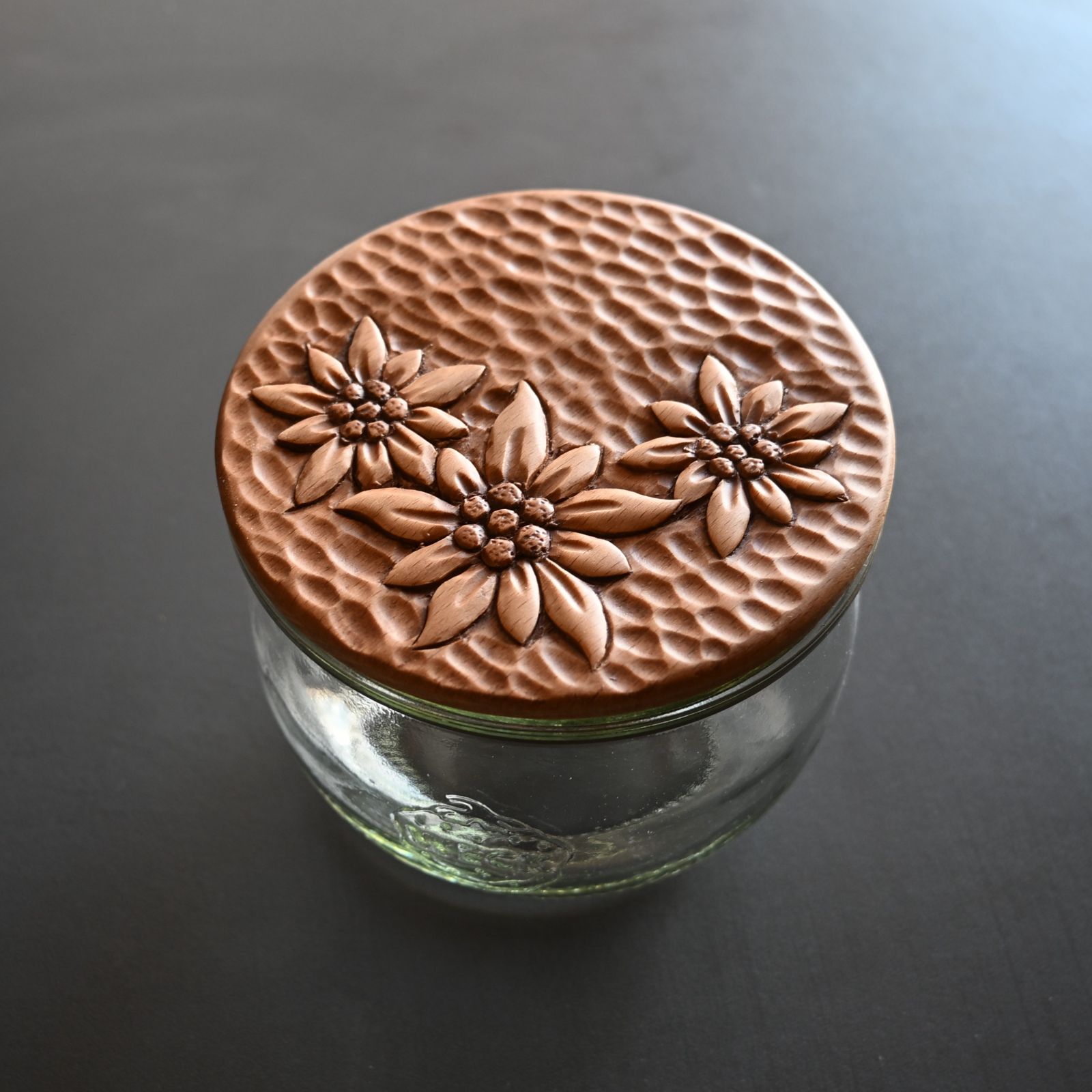Weckglas mit Edelweiss-Trio Schnitzerei