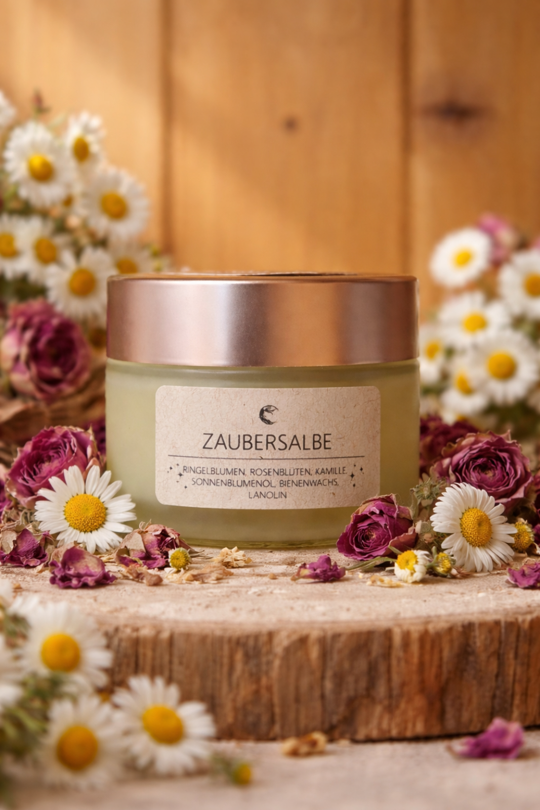 Inhalt: Ringelblumen, Kamillenblüten (vom Garten), Rosenblüten, Sonnenblumennöl, Lanolin, Bienenwachs